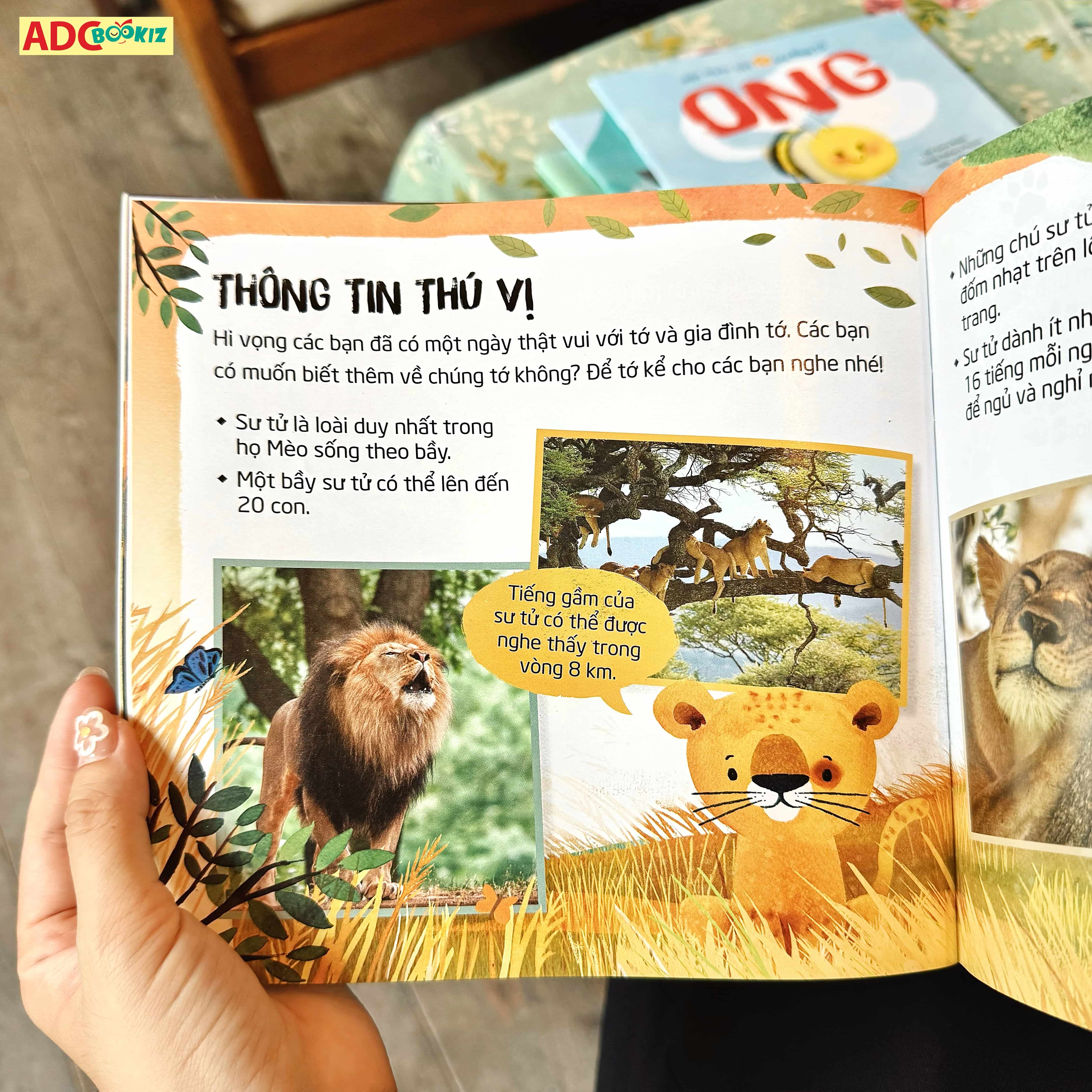 Cuốn sách Sư tử là lời kể chuyện của bạn sư tử nhỏ đang sống cùng bố mẹ, anh chị em ruột cùng nhiều cô bác và anh chị em họ thành một bầy sư tử. Một ngày của gia đình sư tử trên thảo nguyên châu Phi mênh mông luôn có nhiều điều thú vị, các bé hãy mở sách ra và trải nghiệm một ngày cùng tớ nhé!